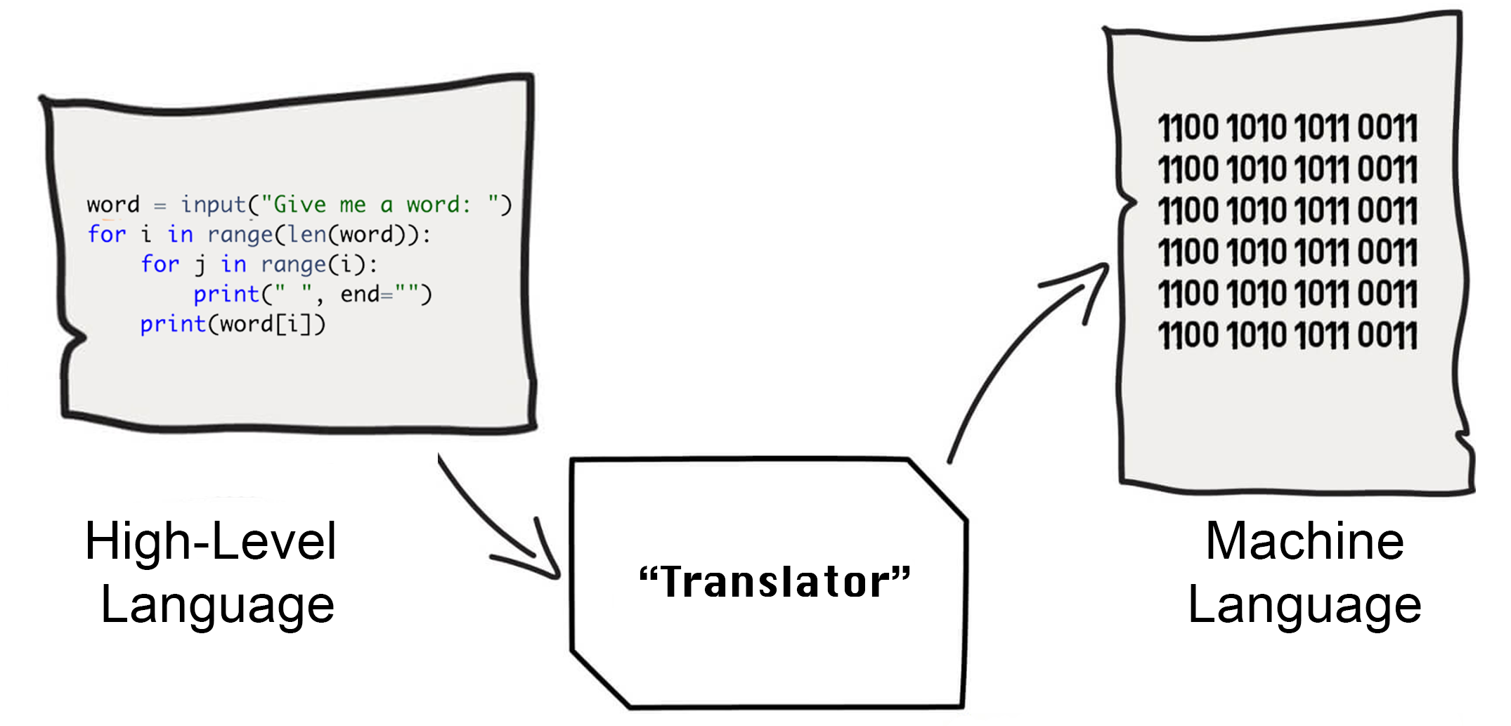 When we “Execute the Program” the computer checks if “the spelling makes sense” and it then converts every instruction (basically every line) into sequences of 0s and 1s that the computer knows to interpret as “machine code instructions”, composed of: operations, values, and addresses.