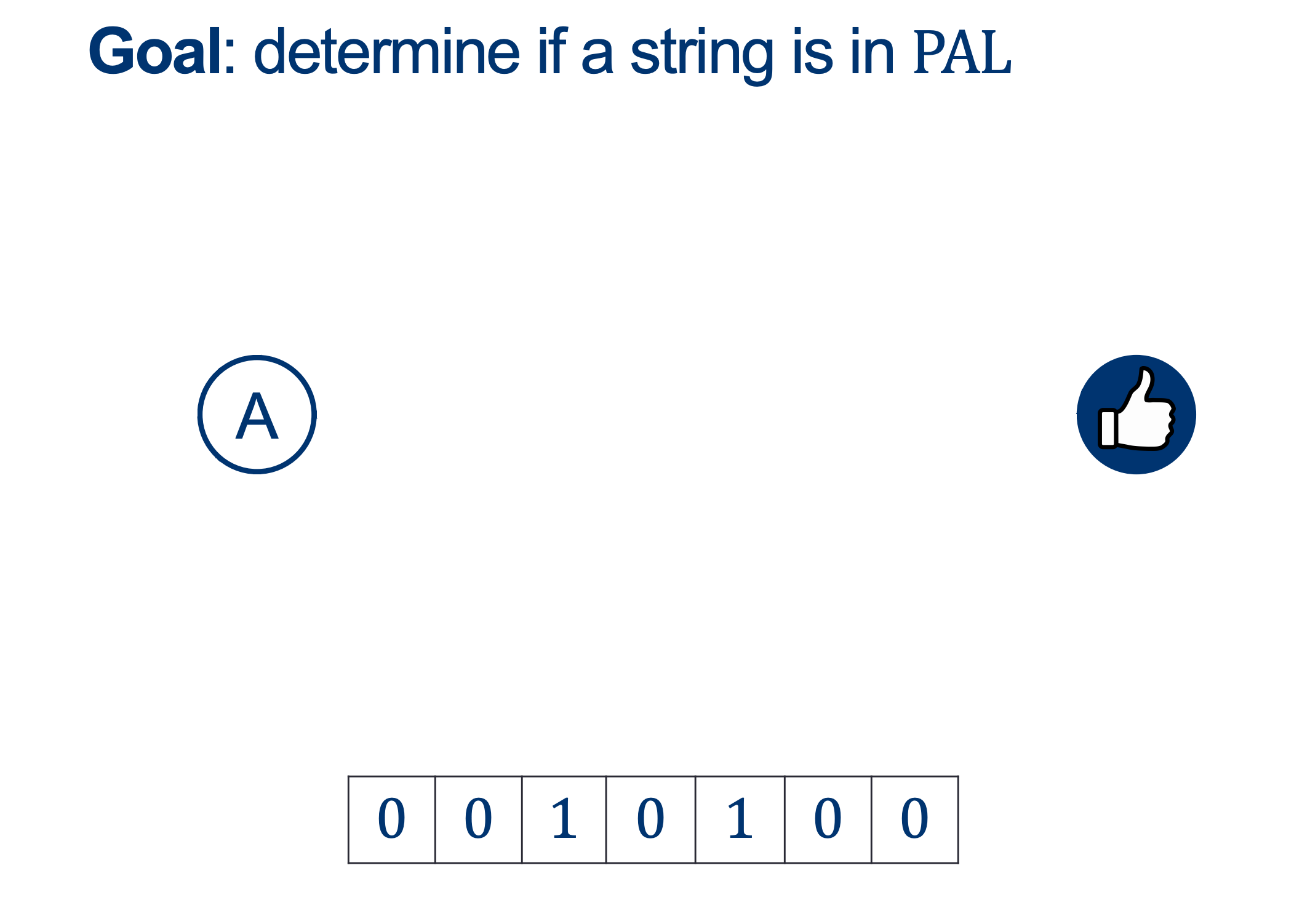 \[\begin{align*} &M_X: \\ & On \; INPUT \; < M_x > \\ & \quad \text{run $M_{HALT} ( < M_x , M_x > )$}\\ & \quad \text{if $M_{HALT}( < M_x , M_x > )$ returns ACCEPT, FLOOP on purpose } \\ & \quad \text{if $M_{HALT}( < M_x , M_x > )$ returns REJECT, ACCEPT } \\ \end{align*}\]- This run of $M_X$ takes in the description of itself $< M_X >$ as input