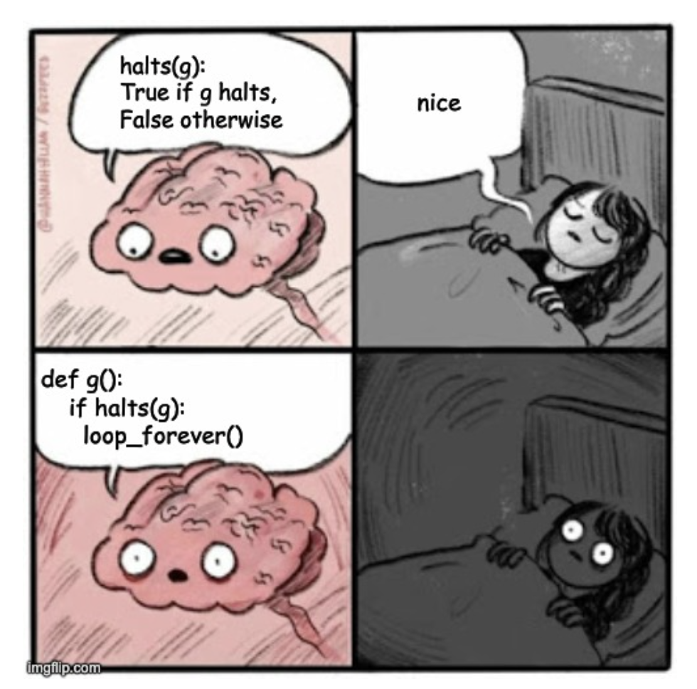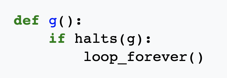 - If halts(g) returns true, then g will call loop_forever and never halt, which is a contradiction.