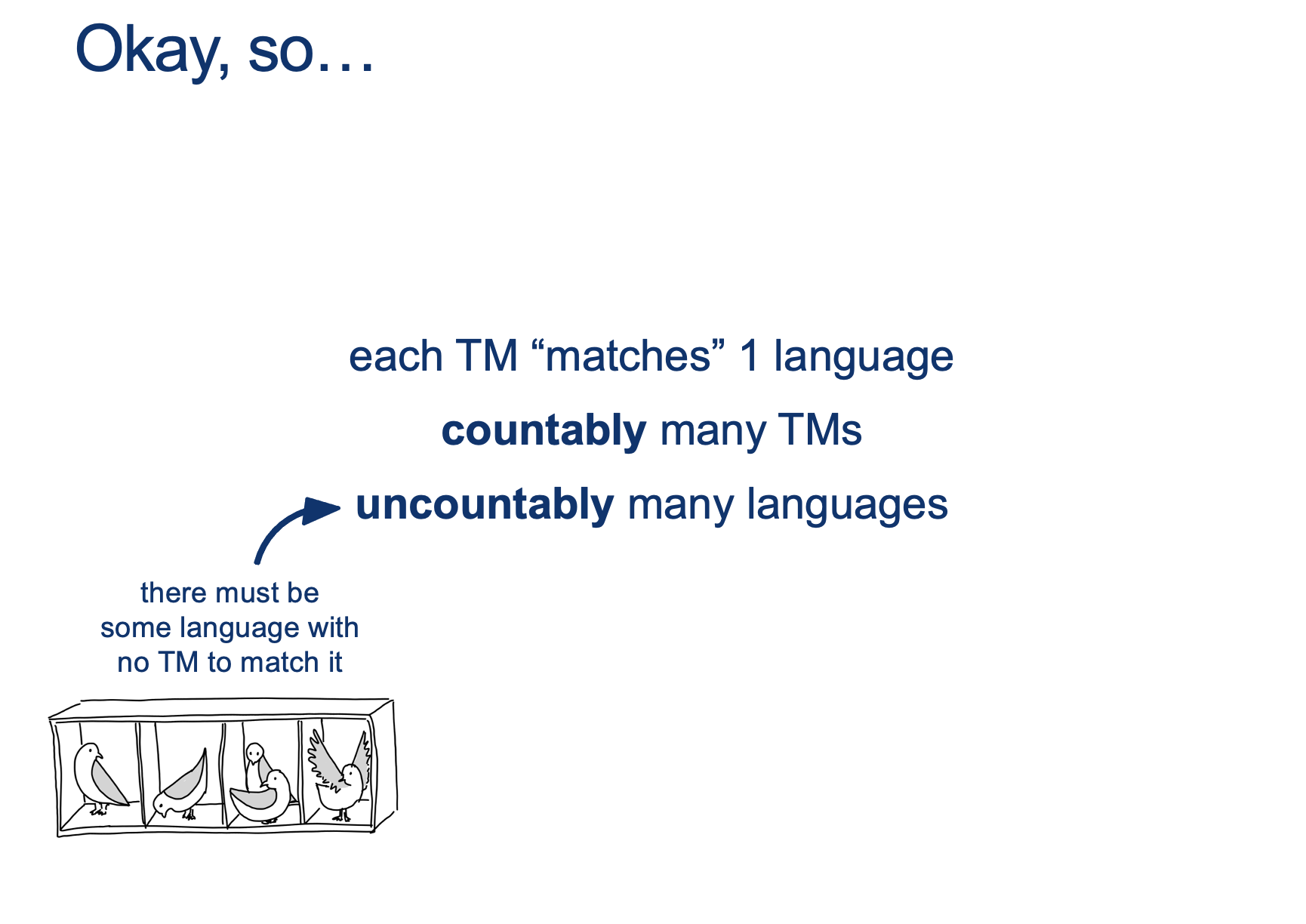 - If $M_{HALT}$ predicts that $M_{X}$ FLOOPS on its own description (REJECT), $M_X$ ACCEPTS!… But that means that we just HALTED when runing $M_{X}$ with its own input (which is exactly the opposite of what $M_{HALT}$ predicted!)