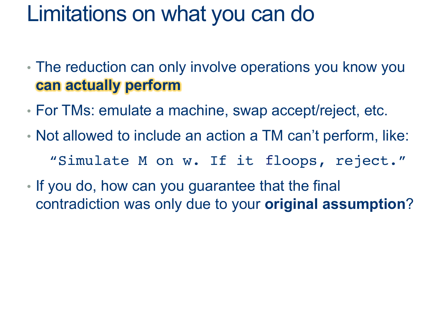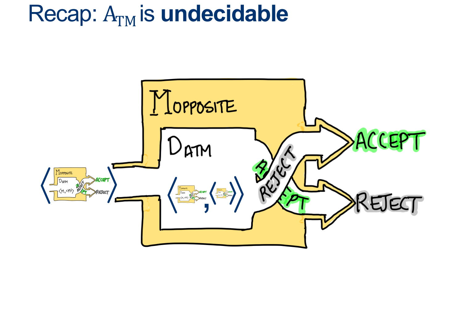 \[\begin{align*} &M_{OPPOSITE}:\\ & \quad \text{ On input $ < M_{OPPOSITE} > $ }:\\ & \quad \text{ Simulate $D_{ATM} \; on \; < M_{OPPOSITE} , M_{OPPOSITE} > $}\\ & \quad \text{ If $D_{ATM}$ accepts, REJECT. }\\ & \quad \text{ If $D_{ATM}$ rejects, ACCEPT. }\\ \end{align*}\]This causes an inconsistent response from $D_{ATM}$: a contradiction