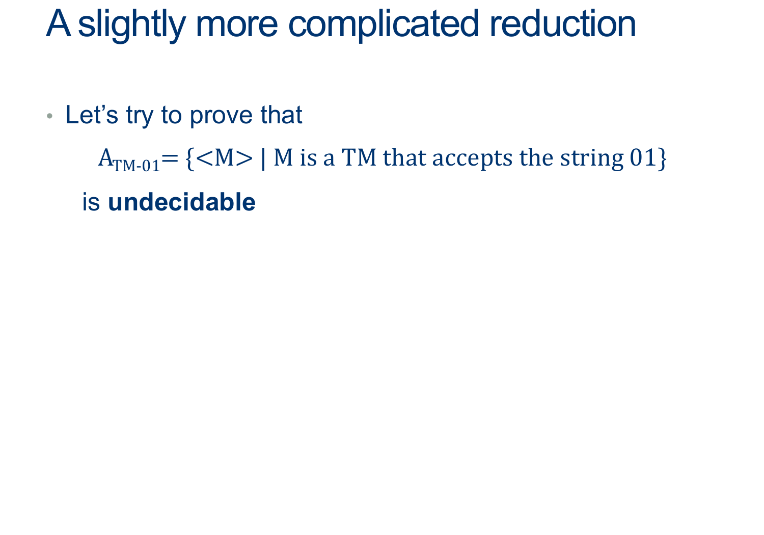 - Inside our $D_{ATM} $ machine, we use $D_{ATM01} $ to ask if its input TM $M$ accepts $01$ ... But in order to do it ... it is forced to simulate the input machine $M$ ... instead of running $D_{ATM01} $ on $M$, we can have $D_{ATM01} $ run on a Trojan-Horse Machine whose only job is to check if $M$ accepts $w$!