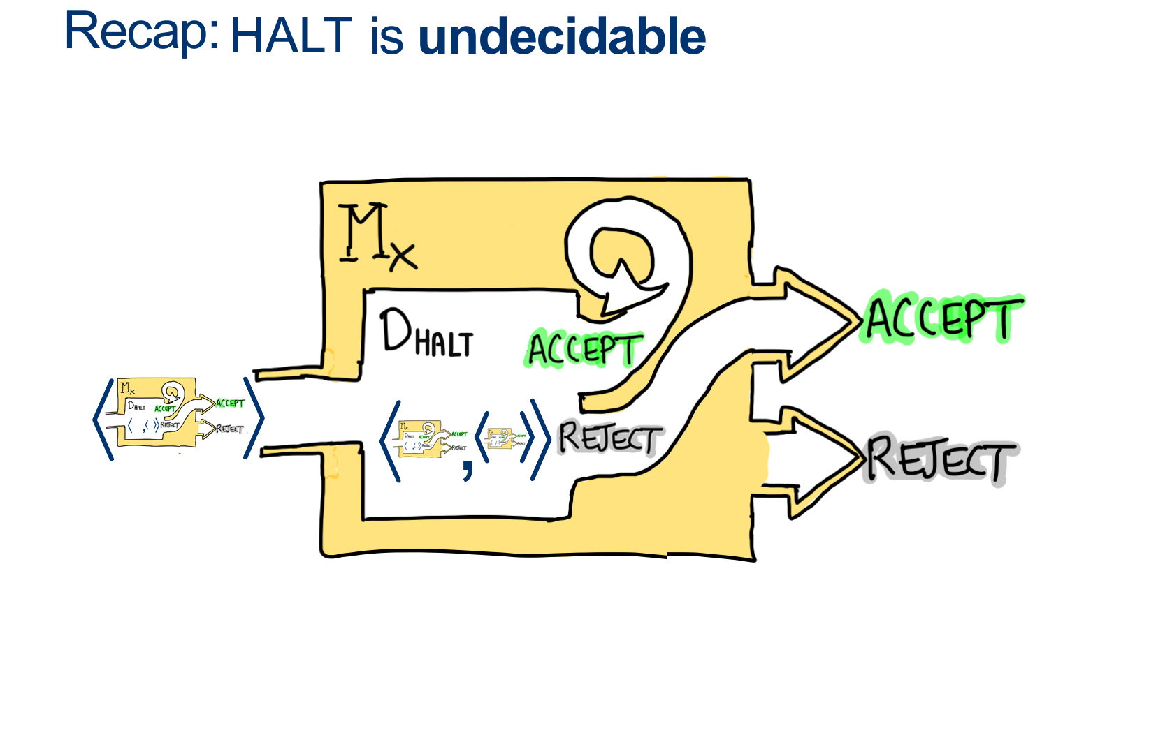 \[\begin{align*} &M_X: \\ & On \; INPUT \; < M_x > \\ & \quad \text{run $M_{HALT} ( < M_x , M_x > )$}\\ & \quad \text{if $M_{HALT}( < M_x , M_x > )$ returns ACCEPT, FLOOP on purpose } \\ & \quad \text{if $M_{HALT}( < M_x , M_x > )$ returns REJECT, ACCEPT } \\ \end{align*}\]This causes an inconsistent response from $D_{HALT}$: a contradiction