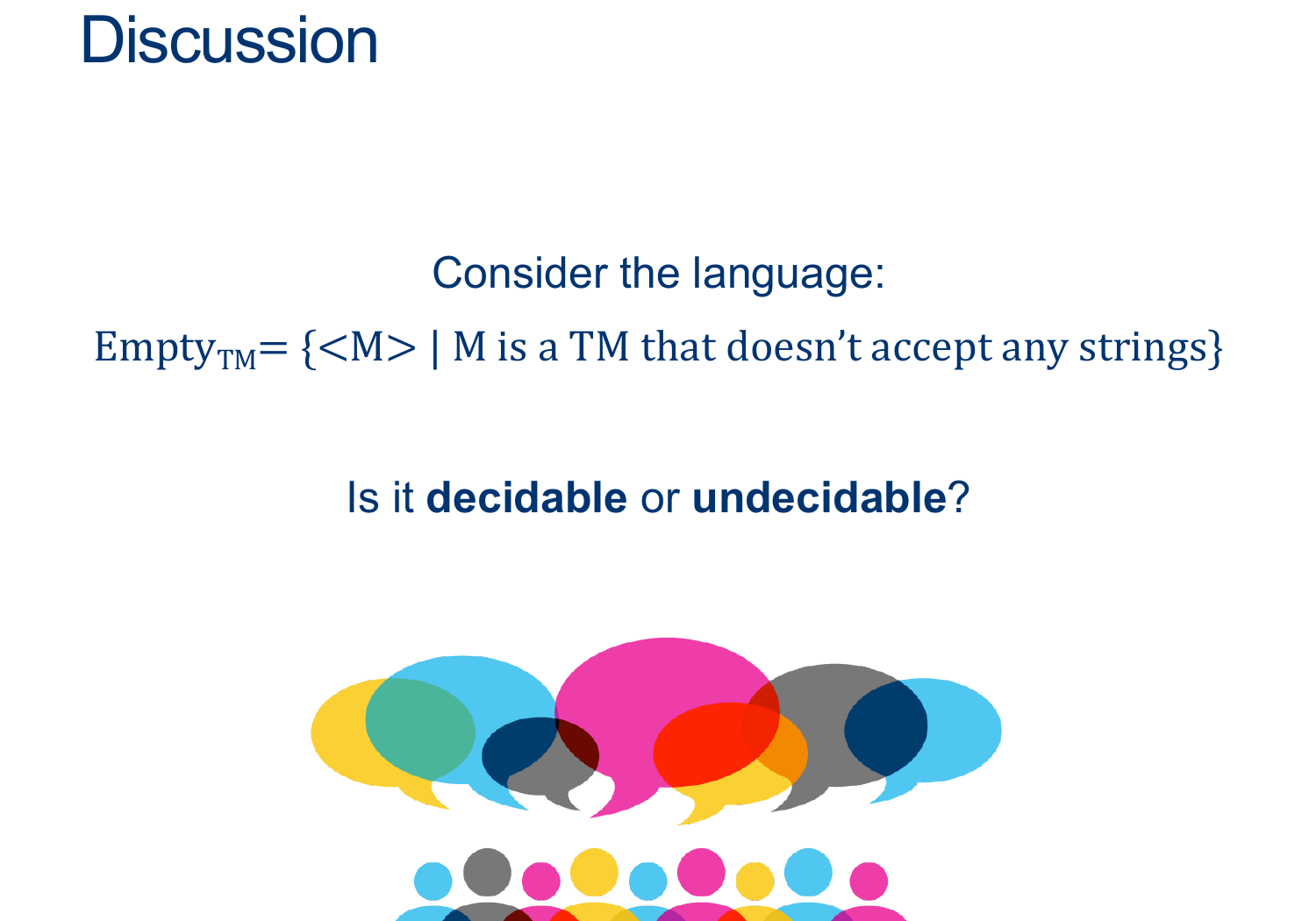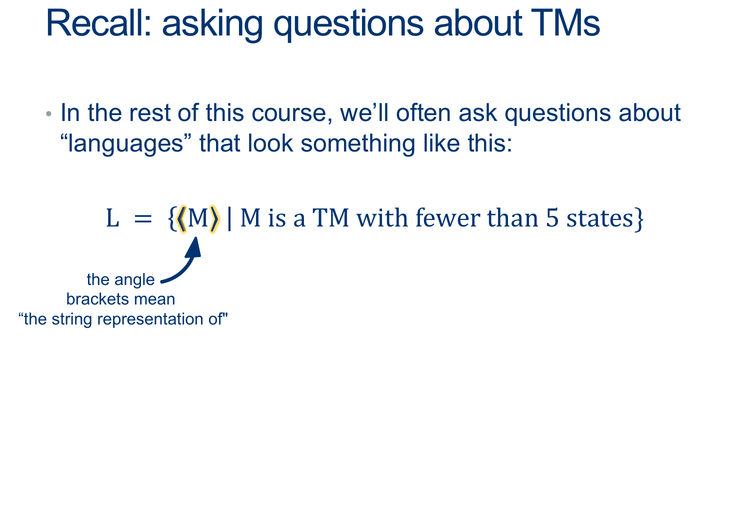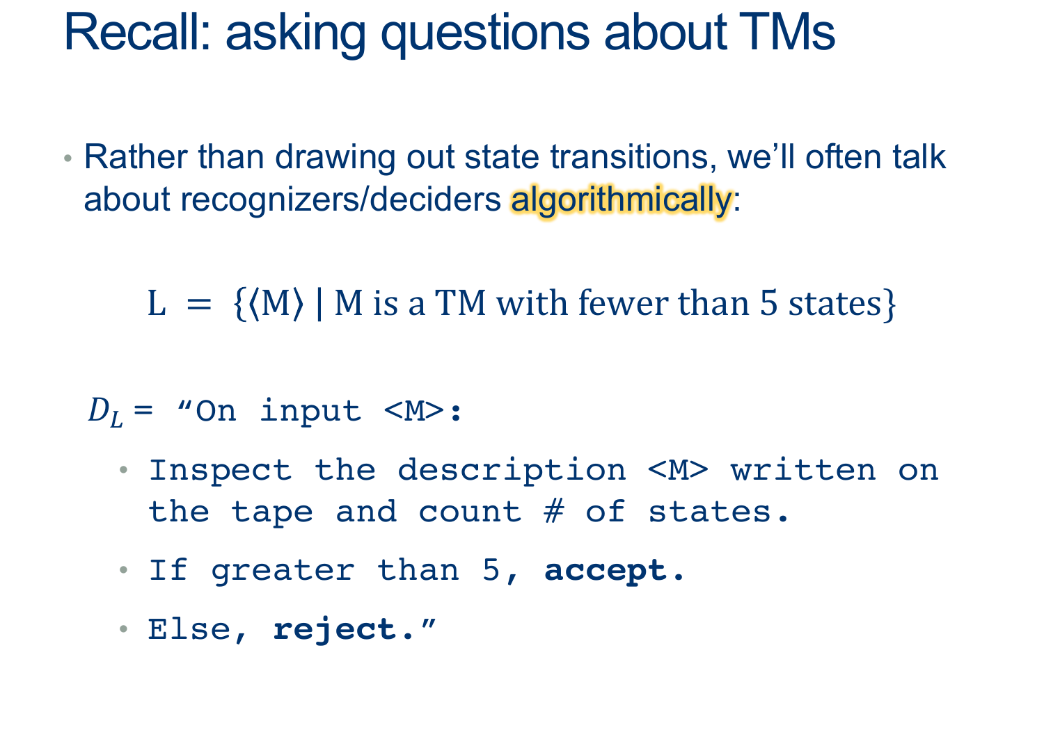Another Turing Machine!! ... A Decider for $L$ we'll call $D_L$ $$ \begin{align*} & D_L :\\ & \text{On INPUT } < M >\\ & \quad \text{Inspect the description of } M \\ & \quad \quad \text{IF $M$ is not a valid TM: REJECT} \\ & \quad \quad \text{ELSE IF $M$ has fewer than 5 states: ACCEPT} \\ & \quad \quad \text{ELSE: REJECT} \\ \end{align*} $$ CAN we get stuck on a loop? (Note that we know something about description $M$ that helps us answer this question)