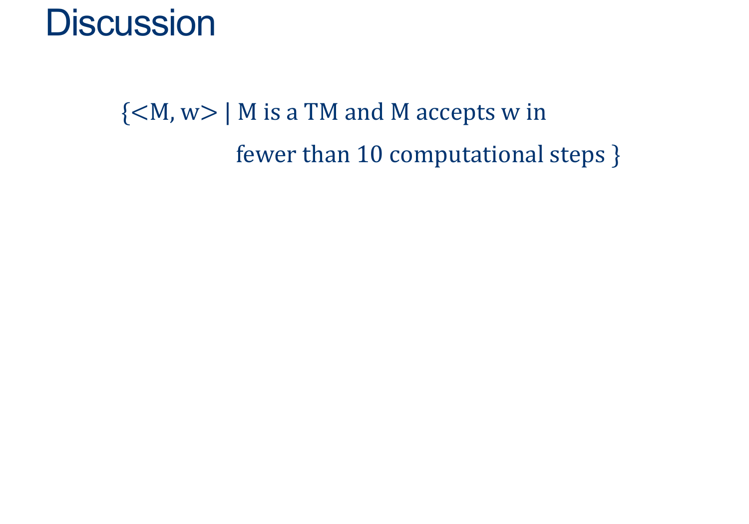 \[L = \{ < M, w > | TM \; M \text{ accepts } w \text{ in fewer than 10 steps} \}\]Discuss if you could build $D_L$ for the following language: