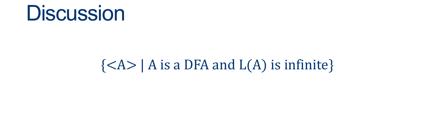 \[L = \{ < A > | \text{DFA $A$ accepts an infinite number of words (L(A) is infinite)} \}\]Discuss if you could build $D_L$ for the following language: