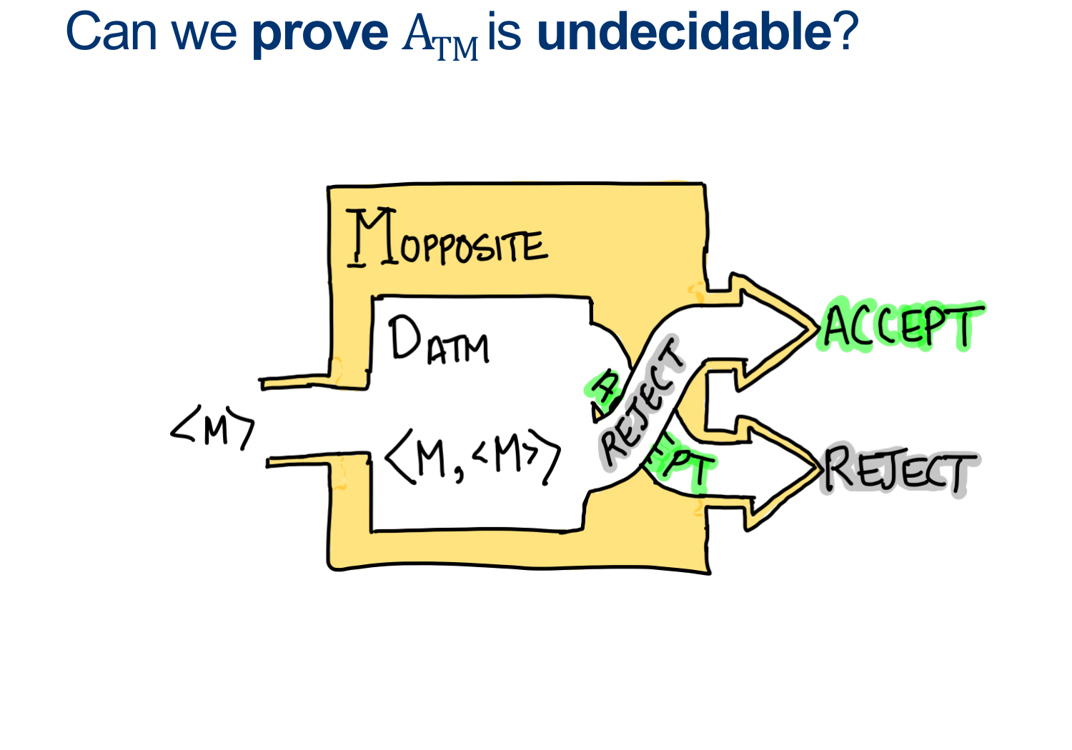 \[\begin{align*} &M_{OPPOSITE}:\\ & \quad \text{ On input $ < M > $ }:\\ & \quad \text{ Simulate $D_{ATM} \; on \; < M , < M > > $}\\ & \quad \text{ If $D_{ATM}$ accepts, REJECT. }\\ & \quad \text{ If $D_{ATM}$ rejects, ACCEPT. }\\ \end{align*}\]