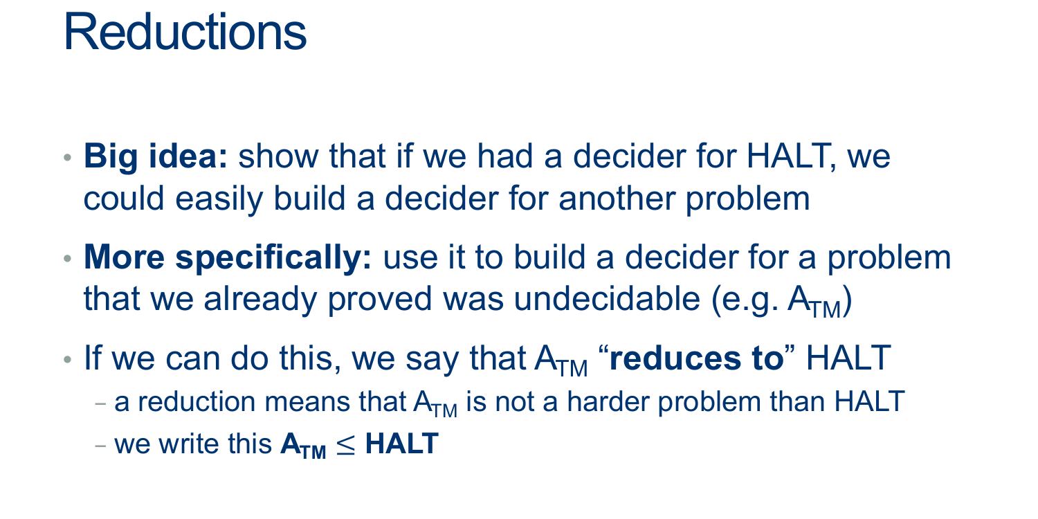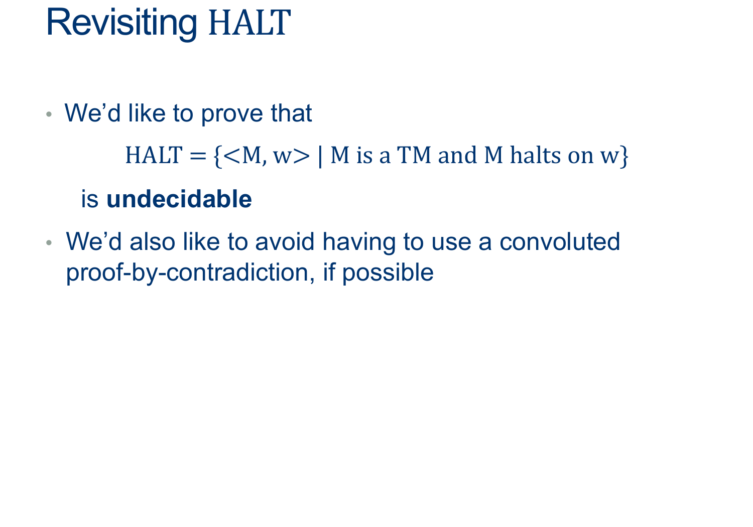 However, we proved that ATM was undecidable by contradiction just a few minutes ago. Aaaand...the only condition we need to build $D_{ATM}$ was that $D_{HALT}$ existed, so ... $D_{HALT} \; $ must not exist.