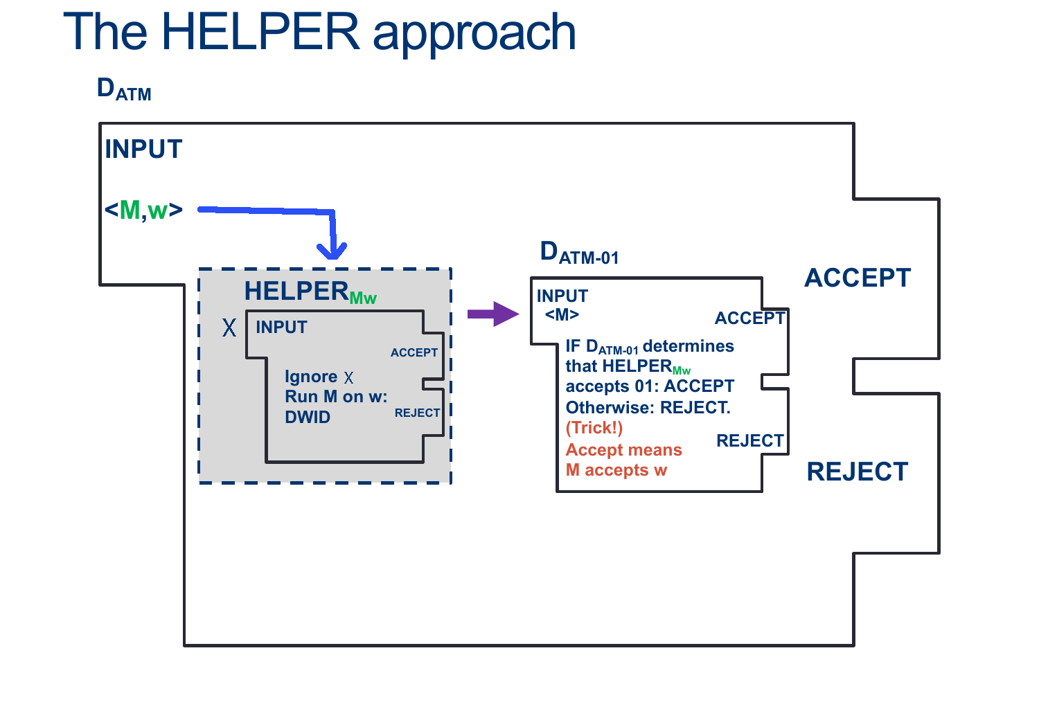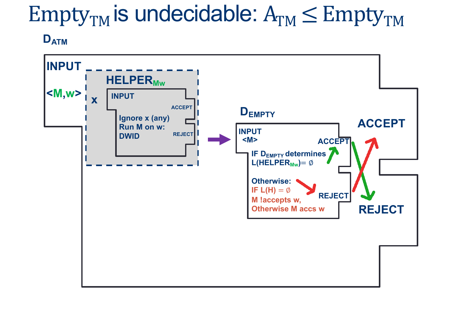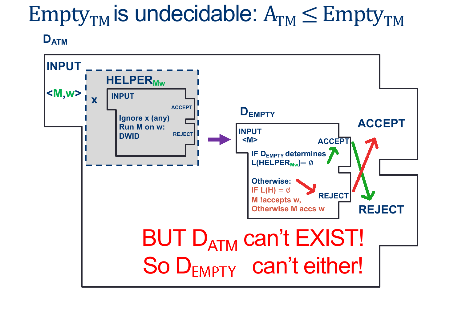 \[\begin{align*} &D_{ATM}:\\ & \text{ On input $ < M, w > $ }:\\ & \text{ Create (but don't run) $HELPER_{M,w}$ such that}\\ & \quad \text{ On input $ < X > $ }:\\ & \quad \quad \text{ Ignore $ < X > $ }\\ & \quad \quad \text{ Run $M$ on $w$ ADWID}\\ & \text{ Now Run $D_{EMPTY-TM}$ on $HELPER_{M,w}$}\\ & \text{ If $D_{EMPTY-TM}$ rejects, invert the result and our machine ACCEPTS}\\ & \text{ If $D_{HALT}$ accepts, , invert the result and our machine REJECTS}\\ \end{align*}\]As we saw above, the ONLY way $D_{EMPTY-TM}$ Rejects is if $HELPER_{M,W}$ Accepts, which happens ONLY when $M$ accepts $w$.