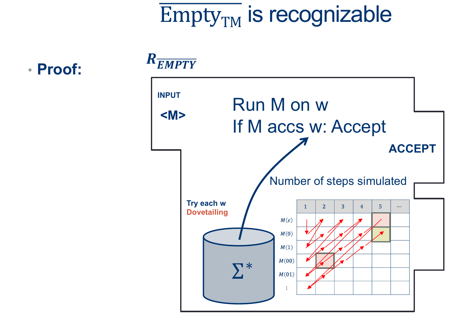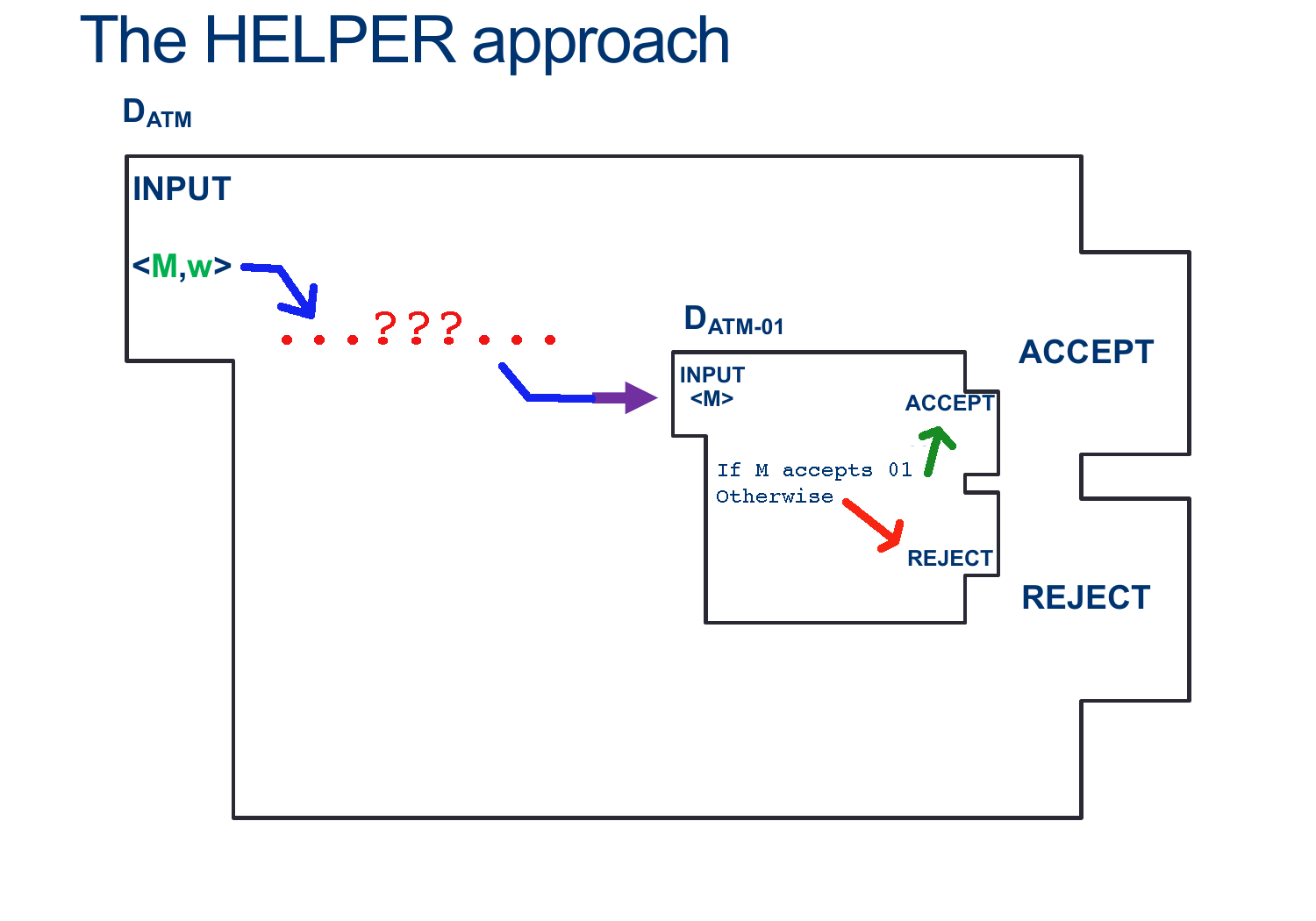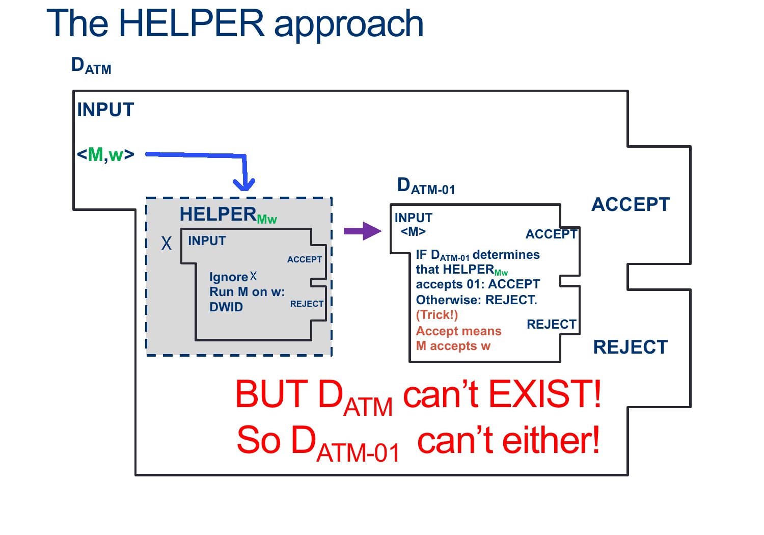 \[\begin{align*} &D_{ATM}:\\ & \text{ On input $ < M, w > $ }:\\ & \text{ Create (but don't run) $HELPER_{M,w}$ such that}\\ & \quad \text{ On input $ < X > $ }:\\ & \quad \quad \text{ Ignore $ < X > $ }\\ & \quad \quad \text{ Run $M$ on $w$ ADWID}\\ & \text{ Now Run $D_{EMPTY-TM}$ on $HELPER_{M,w}$}\\ & \text{ If $D_{EMPTY-TM}$ rejects, invert the result and our machine ACCEPTS}\\ & \text{ If $D_{HALT}$ accepts, , invert the result and our machine REJECTS}\\ \end{align*}\]As we saw above, the ONLY way $D_{EMPTY-TM}$ Rejects is if $HELPER_{M,W}$ Accepts, which happens ONLY when $M$ accepts $w$.