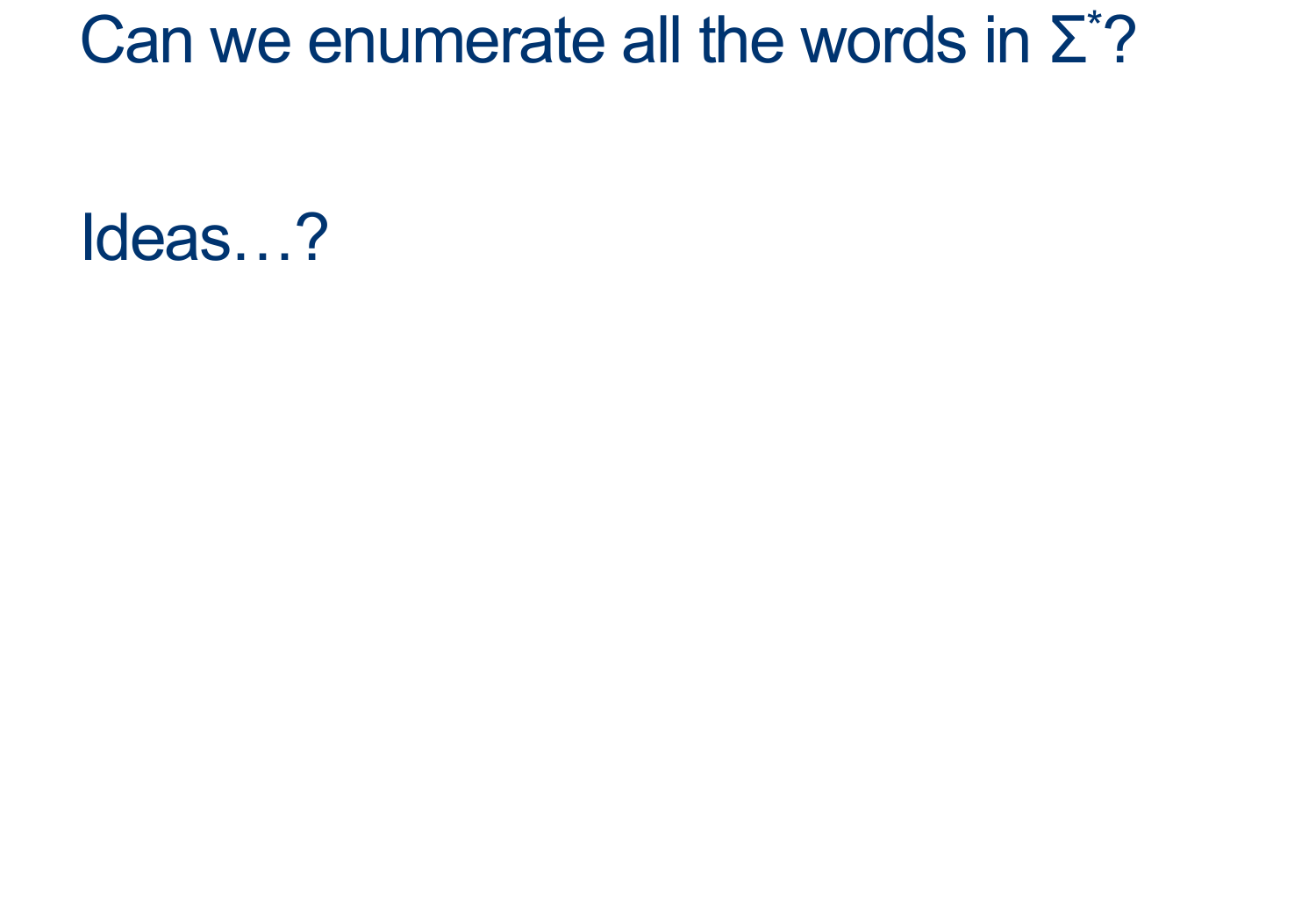 Activity 3 [2 minutes] In groups, come up with an algorithm to enumerate $\Sigma^*$?:
