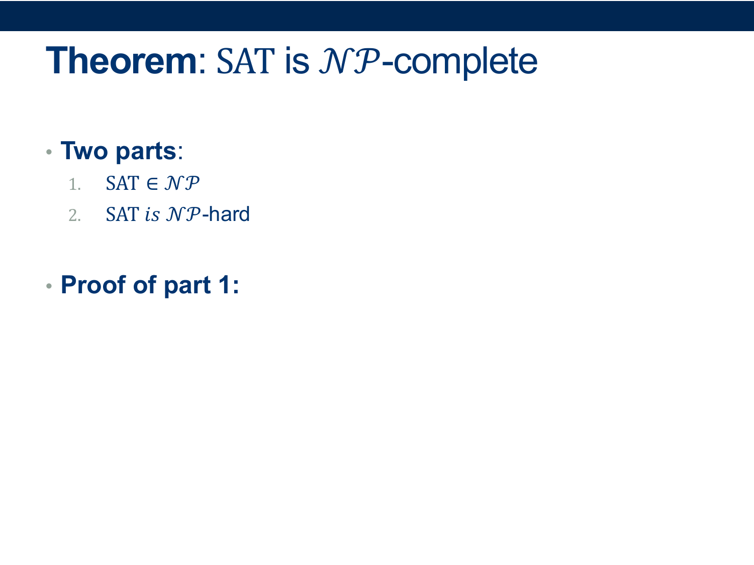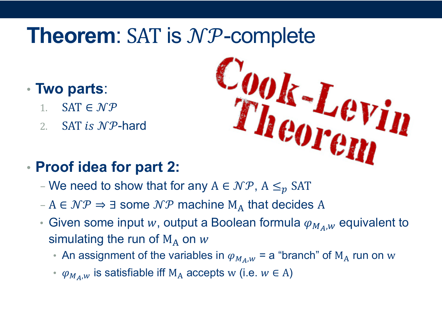 That is, if we could solve SAT, we could solve any problem A that’s in NP. - Since AND, OR and NOT form a universal system, i.e, a basis for Boolean logical operators, we know we can can construct a boolean formula that simulates the transitions of a Turing Machine.
